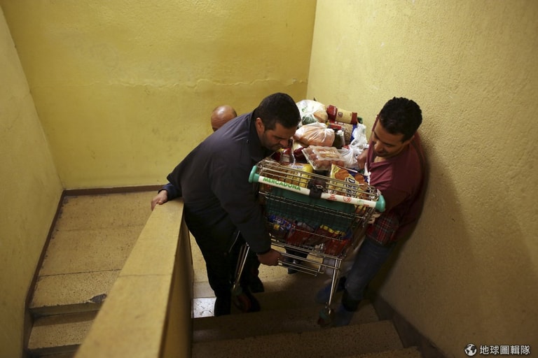 瑪尼莎(Majid Mnissar,左)和卡莫( Mostafa Kamal,右)以及另一名食物銀行的成員一起搬著裝買食物用品的購物車上樓,他們剛剛一起完成了蒐集食物的工作。