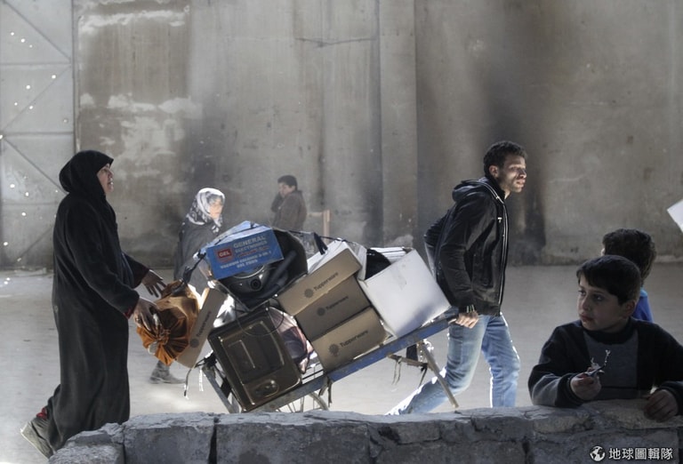 男人拉著他們的家當往前進,他們走在哈傑斯(Karaj al-Hajez)通道上,這條道路就位在反政府軍和政府軍所掌控的土地之間。《路透社》的攝影師發現這條通道擠滿了敘利亞民眾,他們被空拋的桶狀炸彈襲擊,被迫離開家園。