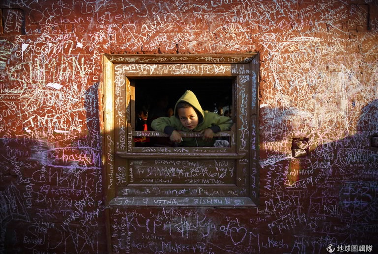 小男生從Saraswati寺廟的窗戶向外望,窗戶旁的牆上滿是粉筆寫滿的字跡。尼泊爾當地正值年度重要節日「教育女神節」(Shreepanchami festival),節慶期間,孩子們會在這座寺廟中習字閱讀,當地人相信這樣能得到神明的庇佑,讓他們在學業上有好的表現
