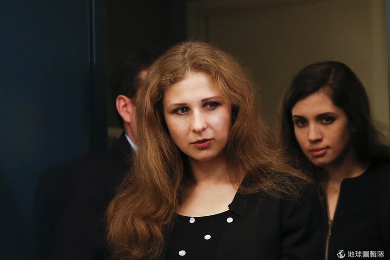 照片中是俄國有名的政治活動分子「暴動小貓」成員,托洛孔尼科娃(Nadezhda Tolokonnikova,右)和阿廖欣娜(Maria Alyokhina,左),他們到紐約參加國際特赦組織所辦的「讓人權回家演唱會」,兩人將在活動上表演。