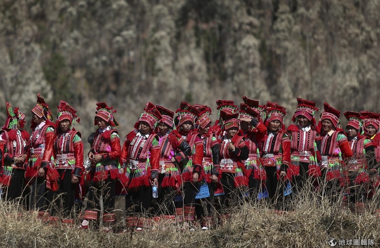 雲南新平縣的彝族姑娘們正準備參加當地的新年慶賀活動