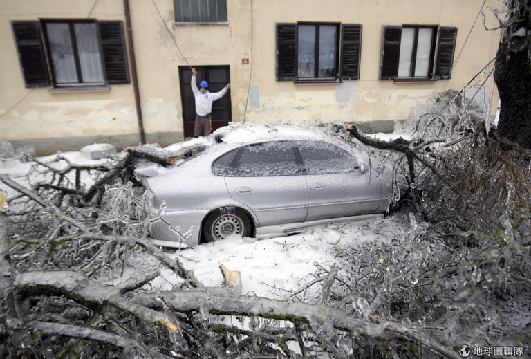 周末碰上連日大雪的斯洛維尼亞,當地許多家戶面臨無電可用的窘境。照片中是電力公司的人員,他正試著把毀壞的纜線移開