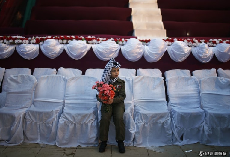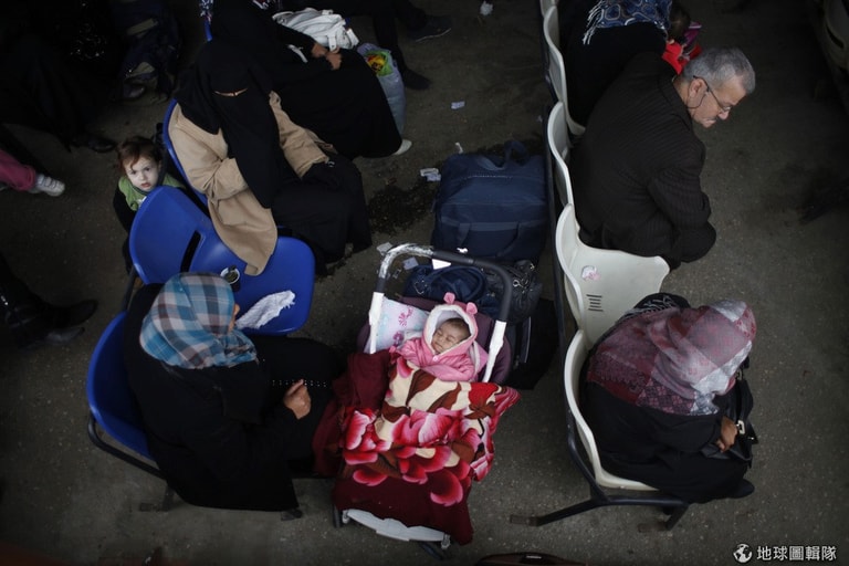 小女孩跟媽媽坐在一塊,她們正等著通過連結埃及與加薩走廊兩地的拉法通道(Rafah crossing)。埃及政府從2013年7月開始關閉這條通道,只有人道救援目的可以通過。4號時,當地再度傳出通道開放的消息,這對需要進入埃及的民眾來說是個好消息。