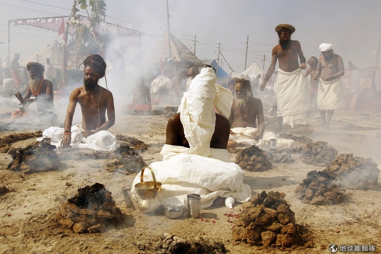 印度聖人(Sadhus)圍坐在用稻草和牛糞做成的燃燒物(Upale)附近祈禱,他們附近是聖河恆河。印度近日正是重要節日「浴佛節」(Magh Mela)的日子