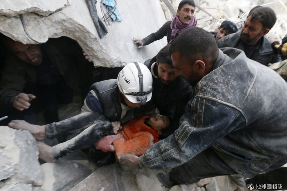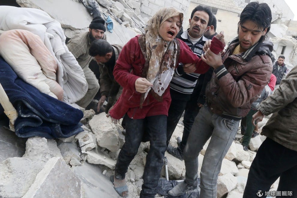受到政府軍空襲的民眾,他們忙著把躺在碎石中的女孩挖出來