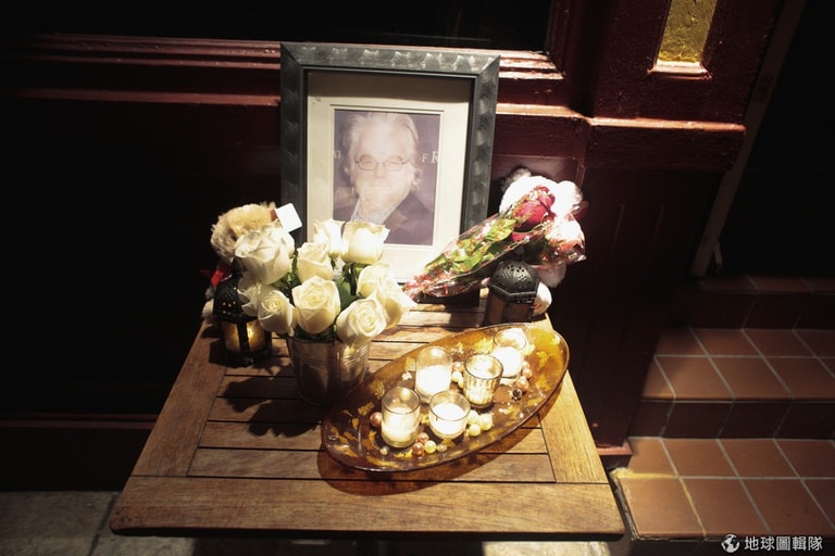 一間餐廳外放著悼念霍夫曼的花束燭光