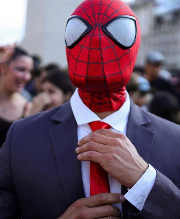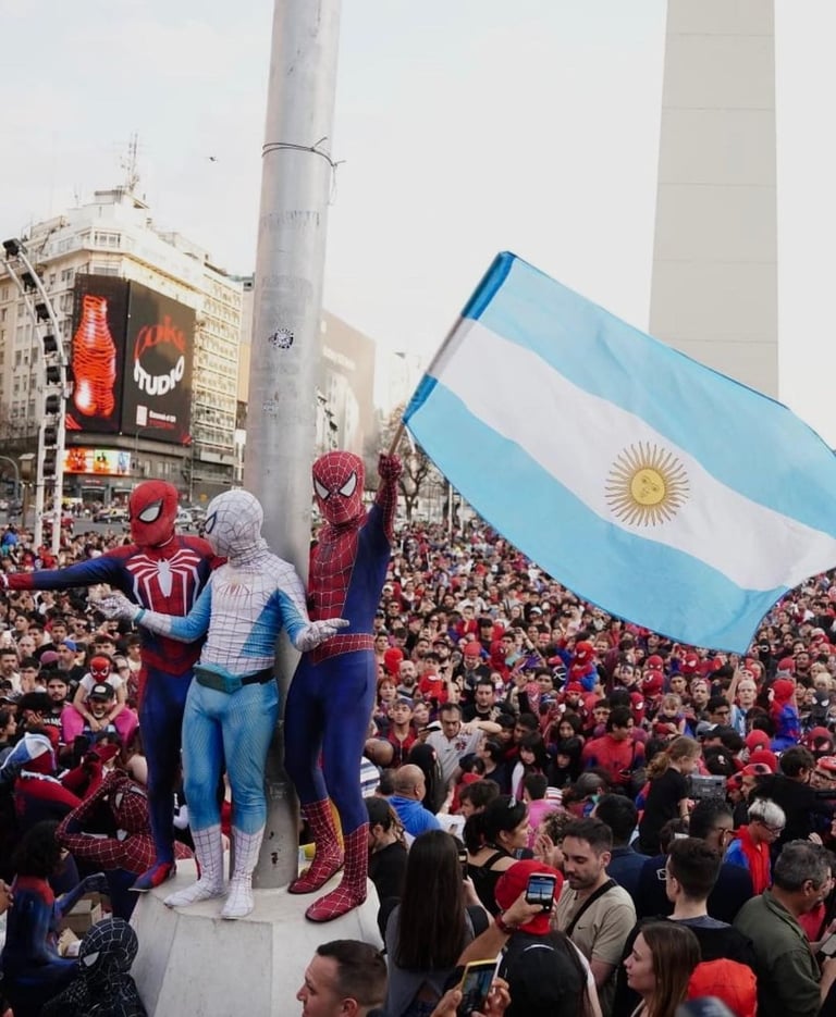 當天的活動中,除了最經典版本的紅藍蜘蛛人,也有人穿上藍、白、黃色組成的蜘蛛人服裝,驕傲地站在顏色相同的阿根廷國旗旁;還有一名參加者身著西裝、繫上紅色領帶,與蜘蛛人的頭套形成有趣的搭配。