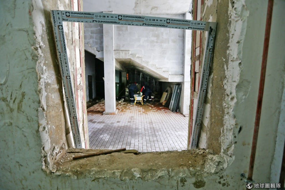 建造到一半的窗櫺之間,可以看到建築工人正努力趕工,他們要完成給採訪奧運活動的各國媒體的公寓,冬季奧運即將在隔天7號舉行。