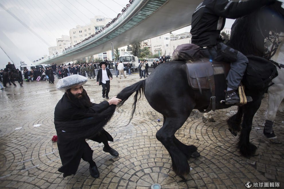 照片中猶太東正教的示威者試圖拉住騎警馬匹的尾巴,他和其他示威者不滿以色列政府的措施,與以色列員警發生衝突。日前,以色列政府針對不想從軍的學生刪除學費補助,引起耶路撒冷當地的東正教猶太人們不滿