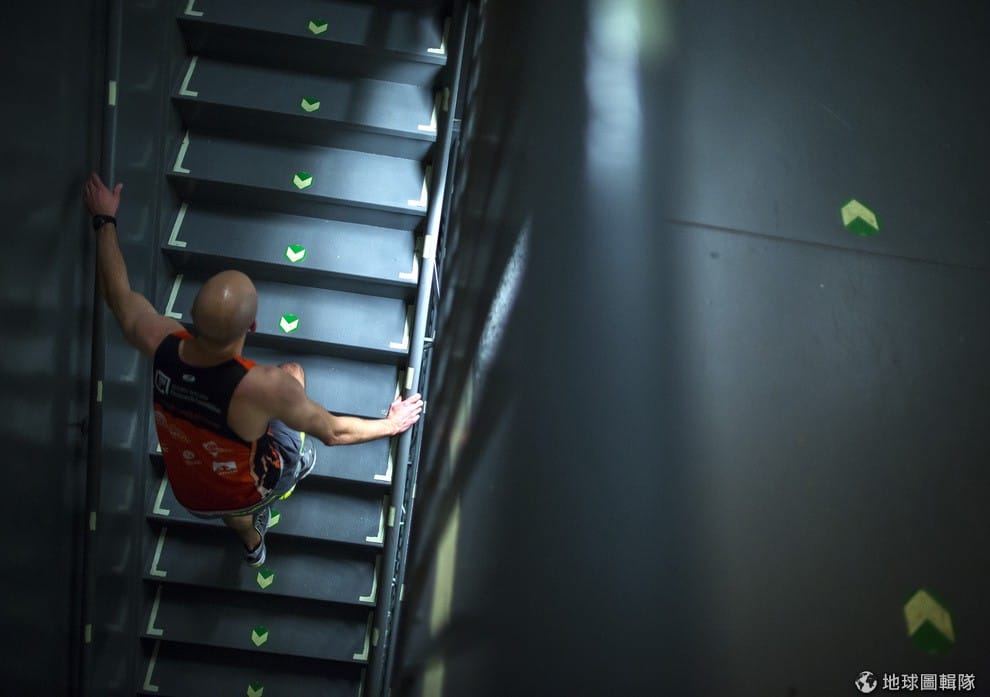 照片中是參加第37屆帝國大廈爬樓競賽(the 37th Empire State Building Run-Up running race)的跑者,參加競賽的人必須爬上1576個階梯,抵達第86層樓。