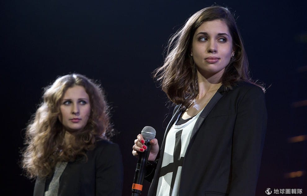 俄國有名的政治活動分子「暴動小貓」成員,阿廖欣娜(Maria Alyokhina,左)和托洛孔尼科娃(Nadezhda Tolokonnikova,右),她們到紐約布魯克林參加國際特赦組織所辦的「讓人權回家演唱會」,兩人在周三的活動上表演,同時也呼籲正在為冬季奧運忙碌的俄國政府,盡快釋放反政府人士。