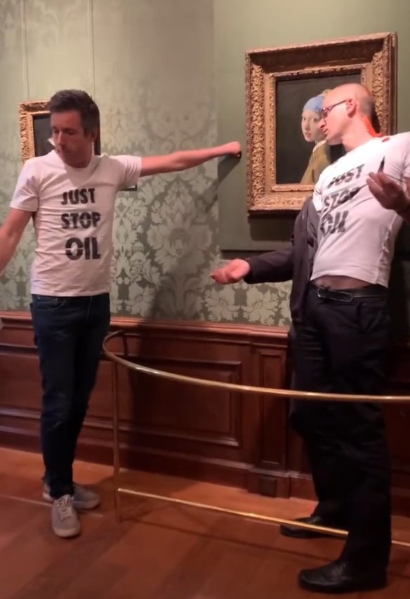 而在義大利,停止石油的成員將手黏在梵谷的名畫《夕陽下的播種者》(The Sower)上。鏡頭轉向荷蘭,停止石油的成員則開始發揮創意,不只黏手,而是選擇將頭黏在韋梅爾(Johannes Vermeer)的畫作「戴珍珠耳環的少女」(Girl with a Pearl Earring)上。