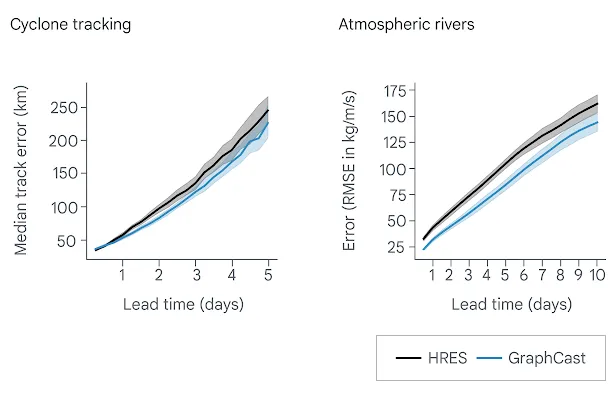 從數據上來看,GraphCast在2到4天的預報時間內,將氣旋預報追蹤誤差減少了大約10到15英里,將與大氣河流相關的水氣預報提高10%到25%,並在5到10天內的預報期,提供了更精確的極端高溫和低溫預報。