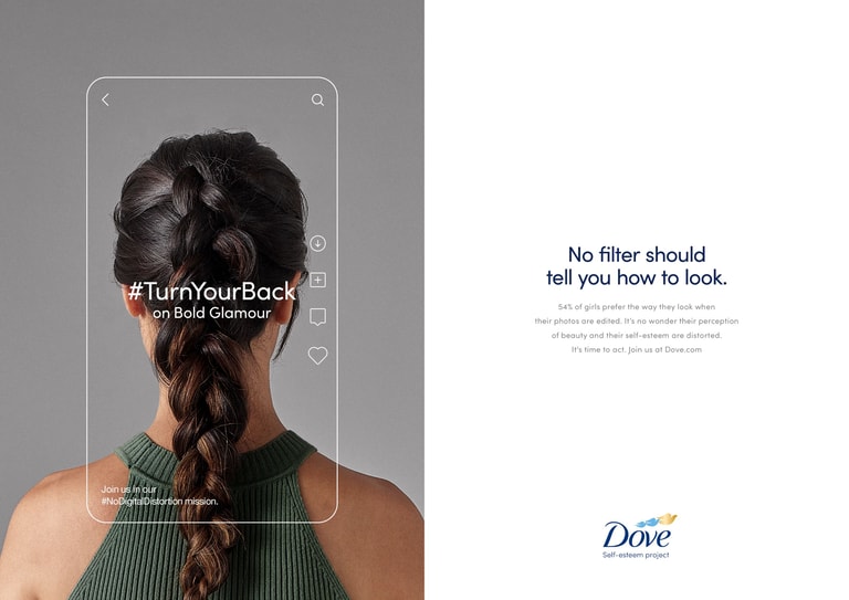 知名護理品牌多芬(Dove)第一個跳出來反對Bold Glamour鼓吹單一的美麗標準,在各大社群平台呼籲大家 #TurnYourBack 不要再使用這種濾鏡,希望喚起大眾對於極端濾鏡的批判。