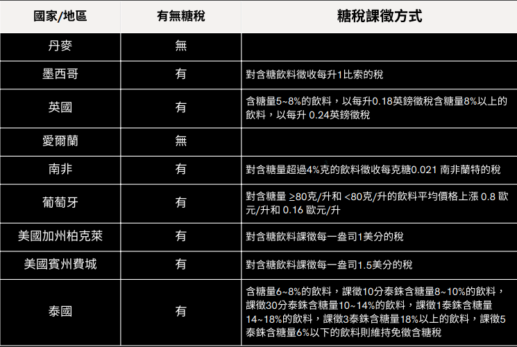 泰國是亞洲第一個對含糖飲料課稅的國家。2015年,調查發現泰國民眾平均每天攝取26茶匙的糖,是世界衛生組織(WHO)建議每日攝取量的4倍,來源多半是含糖飲料。為解決民眾糖分攝取過量的問題,泰國政府從2017年9月16日開始對含糖飲料課稅,並且在2019年加倍徵稅。