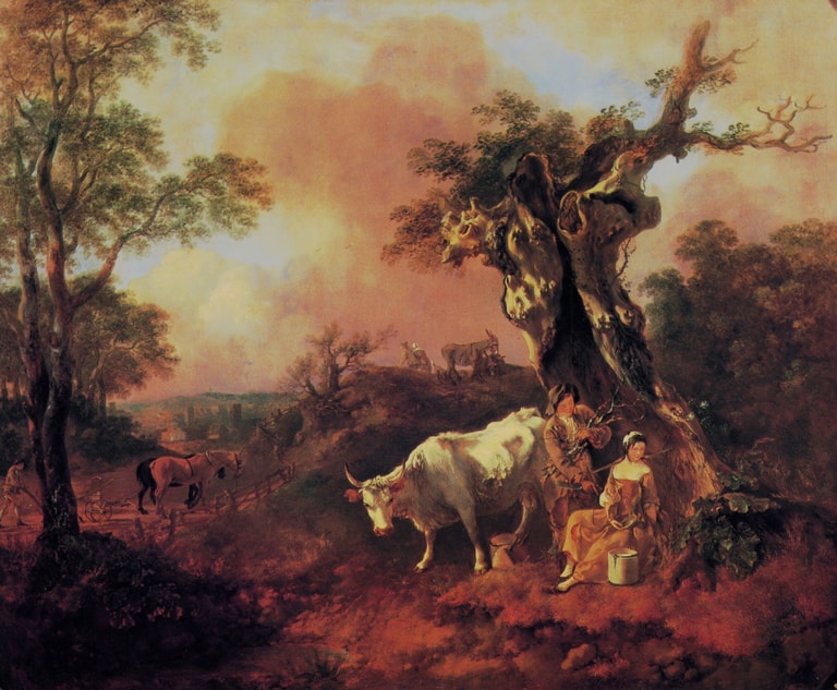 根茲巴羅(Thomas Gainsborough)的〈有牛奶女工的景色〉(Landscape with Milkmaid)便是此時期結合風景畫、農事主題以及鄉村人物的典型作品。根茲巴羅此畫中辛勤勞動的牛奶女工,與過往風景畫傳統裡悠然自在,且多呈現休憩(idle)的牧羊人形象有別,