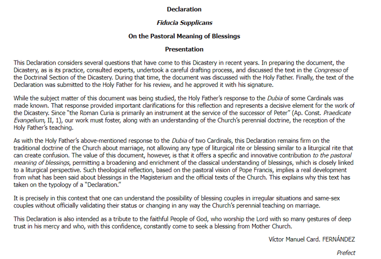 文件的第三部分「不合常規的伴侶和同性伴侶的祝福」(Blessings of Couples in Irregular Situations and of Couples of the Same Sex)則指出,上帝不會拒絕任何接近祂的人,因此不應禁止教會向尋求神幫助的任何人,提供一個簡單的祝福。