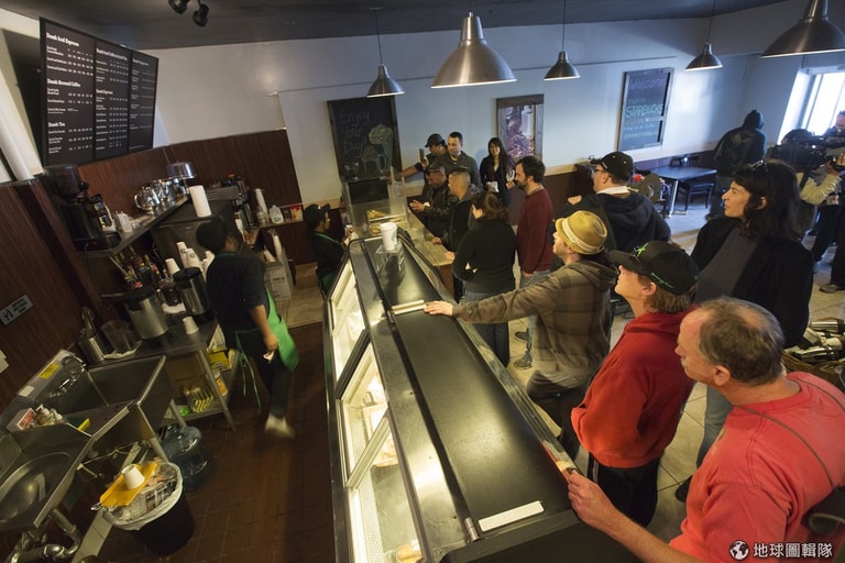 開在洛杉磯洛費利斯(Los Feliz)地區的這間星巴克,乍看之下,那雙尾人魚、綠白相間字樣,還有深褐色的木造空間,都是咖啡龍頭星巴克的標準模樣,但當你走近一看,就會發現店家招牌、店內餐點通通都冠上了「蠢蛋」二字。