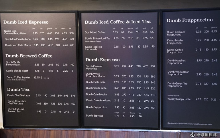 換句話說,你要點餐時,可以來一杯:蠢蛋濃縮咖啡、蠢蛋每日精選、蠢蛋冰茶、蠢蛋拿鐵、或是蠢蛋星冰樂。要決定飲料大小時,每個size前也同樣多了蠢蛋二字。