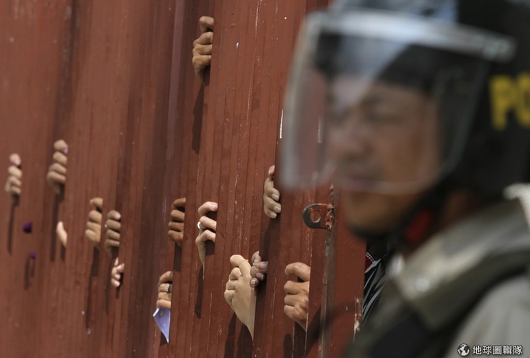 照片中的警察站在柵門旁,他身邊的柵欄間隔中可以見到替囚犯請願的民眾的手。週二(11)時,柬埔寨當地民眾希望能替之前成衣廠暴動中的員工申請保釋出獄,當地法院否決了這項請求。消息傳出後,法院外面約出現200名抗議民眾和警方發生衝突。