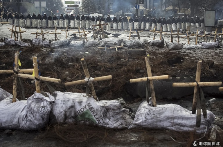 照片中的鎮暴警察站在大量的十字架前,這些十字架是紀念在示威活動期間死亡、或是失蹤的人們。烏克蘭當地反政府行動,目前已邁入第3個月,當地民眾反對現任總統亞努科維奇的聲音仍未間斷,上周日(9)時就傳出民眾再度集結廣場抗議的消息。