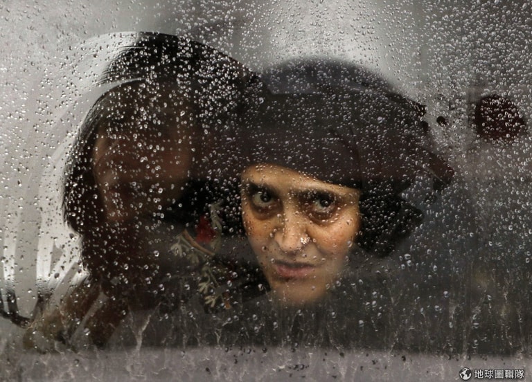 照片中的喀什米爾女性從車窗向外看,她搭乘的車輛正要進入檢查哨所以暫時停下。斯里納加(Srinagar)地區因為出現大規模抗議,目前被印度政府下令進行嚴格管控。
