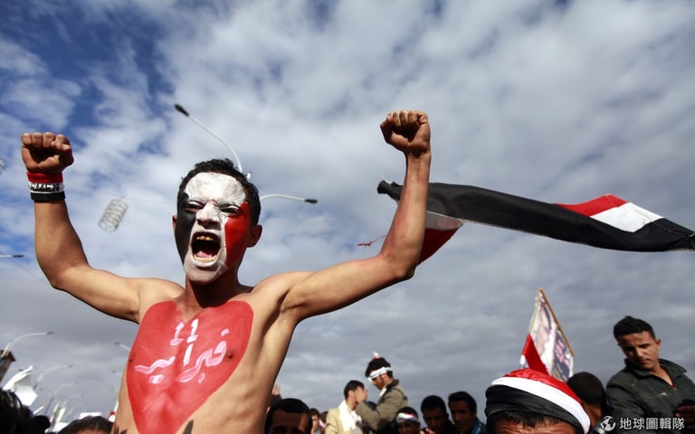 照片中支持民主的示威者高喊口號,他的胸前寫著「2月11日」,當地正值推翻前總統沙雷(Ali Abdullah Saleh)滿周年的紀念日。沙雷在葉門統一後,擔任總統長達34年,他一直連任至2012年辭職。