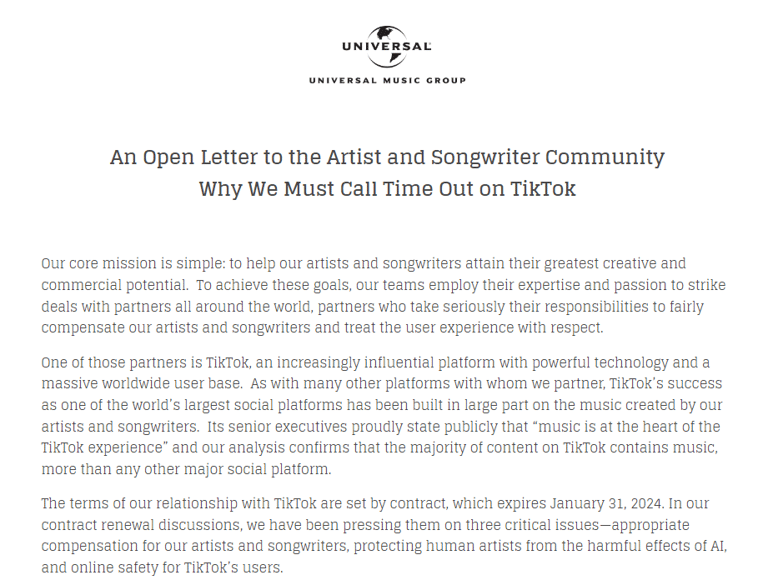 環球音樂在聲明中表示,TikTok的成功就是建基於音樂,平台高層也曾說過「音樂是TikTok體驗的核心」,卻又不願意支付合理的價格。