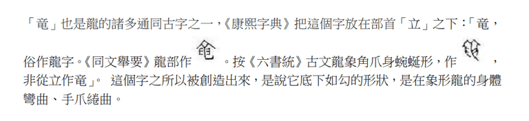 根據教育部的異體字字典,「龍」這個字有十幾個通同古字,像一個馬一個龍,一個帝一個龍等等,這些都是後來造的字,為了避免大家看到以為是手機出現亂碼,這邊就不全部列出來了。「竜」也是龍的諸多通同古字之一,《康熙字典》把這個字放在部首「立」之下:「竜,俗作龍字。《同文舉要》龍部作。按《六書統》古文龍象角爪身蜿蜒形,