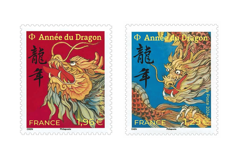 為了迎接農曆新年,法國的郵政集團邀請法籍華裔藝術家陳江洪,以其鮮明的風格設計一套郵票。陳江洪以中國傳統的繪畫技巧,繪製出一幅藍底、眼神直視前方的龍,以及另一幅紅底、向上仰望的龍,形像生動、強烈。