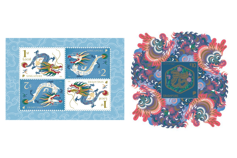新加坡的龍年郵票則採插畫風格。設計師透過沉穩的配色和帶點趣味的圖像,展現出一隻親和力十足的飛龍。郵票又依不同面額分為國內與國際郵票,國內郵票為白底、藍色飛龍,國際郵票則相反。