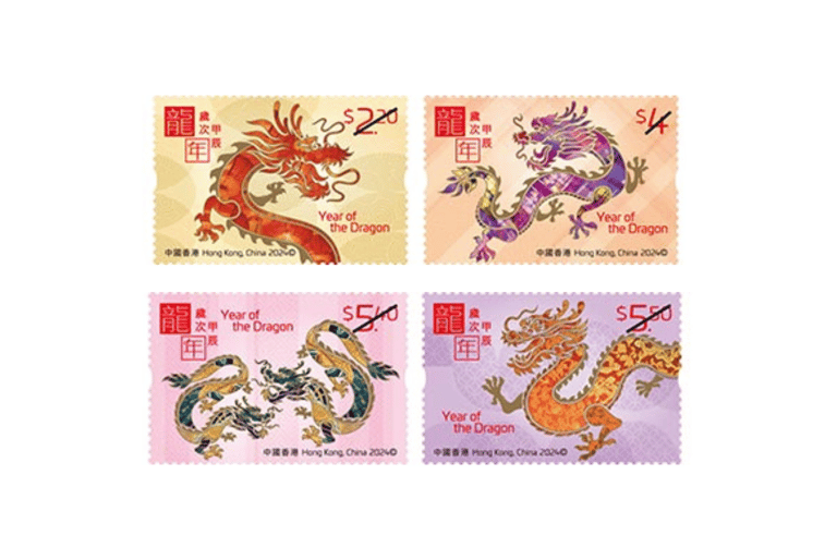 香港推出了四枚不同的龍年郵票,每張郵票中都分別加入不同的節慶元素。