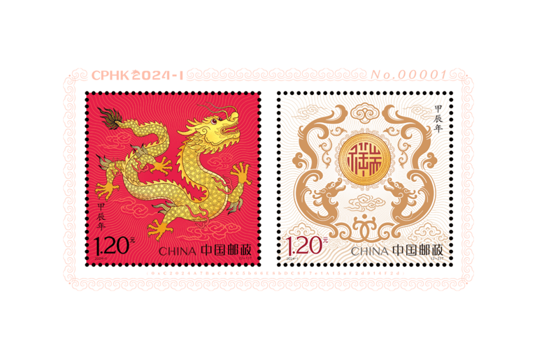 中國發行了一套兩枚的龍年郵票組合。其中紅底的郵票名為「天龍行健」,上面五爪金龍的造型,源自明朝、清朝皇家常用的裝飾「九龍壁」;白底的則名為「辰龍獻瑞」,取材自中國傳統的吉祥紋路「祥龍拱壁」。這兩枚郵票的顏色以紅、金、黑為主,展現喜慶、吉祥的氛圍。