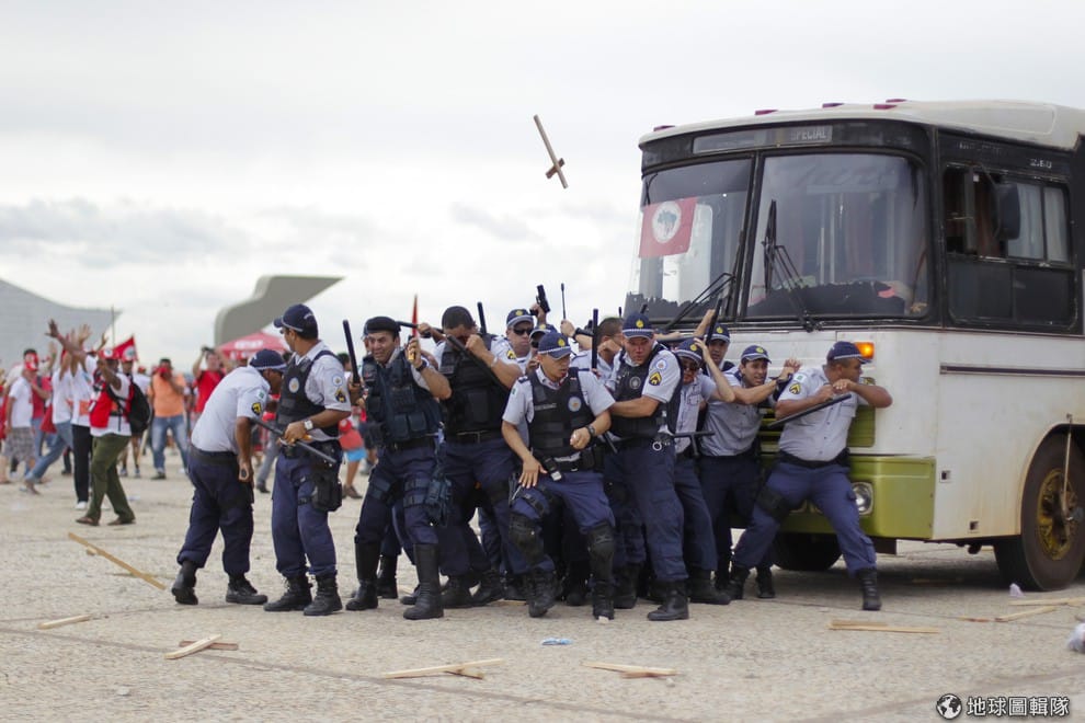照片中的維安員警正在找地方躲避攻擊,12號時,巴西首都巴西利亞(Brasilia)出現農民集結抗議,報導中談到,全球最大的土地改革運動組織巴西「無地工人運動」(Landless Workers Movement)是這次抗議活動的發起者,他們要求政府把閒置不用的土地交給沒有自己土地的農民。