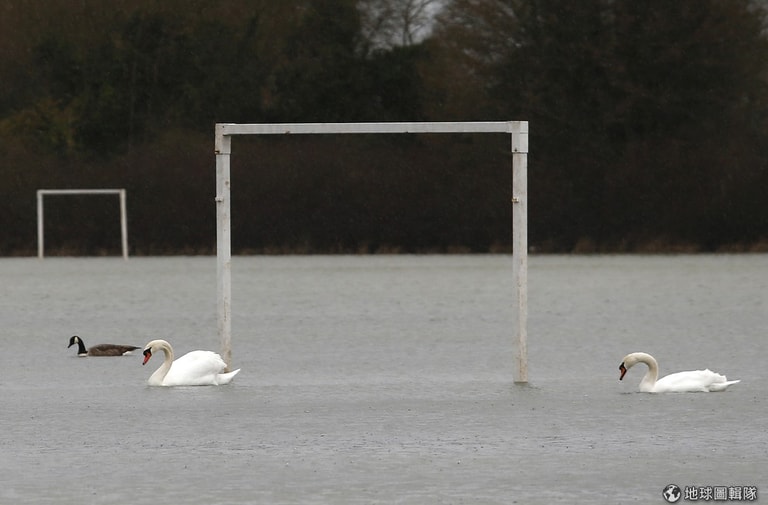 受大水肆虐的英格蘭當地,可以見到天鵝優游在漫漫大水上,牠們的腳下原本是足球場球門。