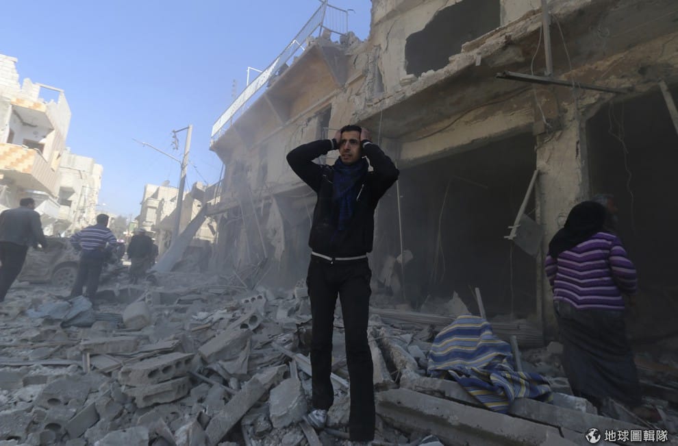 敘利亞大城阿勒坡再度受到政府軍攻擊,照片中的男子手抱頭無助地看著自己的家園遭毀