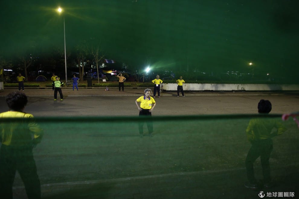 曼谷的倫披尼公園(Lumphini park)中,反政府的示威者們正在作運動。從去年底開始,泰國南區出現民眾要求總理盈拉下台的聲音,這與集結在北區的政府支持者們恰好相反,但走進曼谷市區中,你會同時見到反政府和支持政府民眾分據不同地點。目前不滿泰國政府的抗議行動至今已經持續數個月。