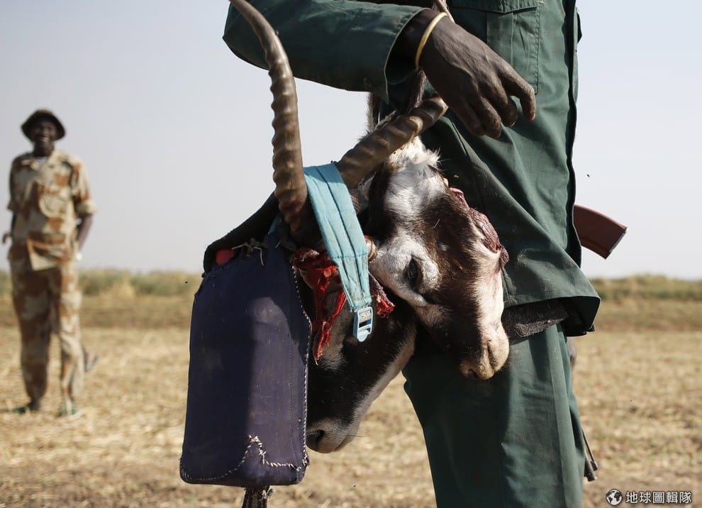 照片中一位努爾族白軍( Jikany Nuer White Army)掛著動物的屍骸在身上,他所在的位置是反政府軍所在的領地。