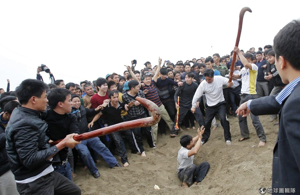 越南河內北邊100公里遠的村落中,當地正在進行新年傳統活動,照片中可見村民們全興奮地圍觀場中央的沙坑,看看有沒有找到紅色木球出現。根據當地習俗,越南民眾在新年來臨時,會進行沙坑找漆球的競賽活動(Hoi Phet fighting ceremony),據說能因此得到福氣。