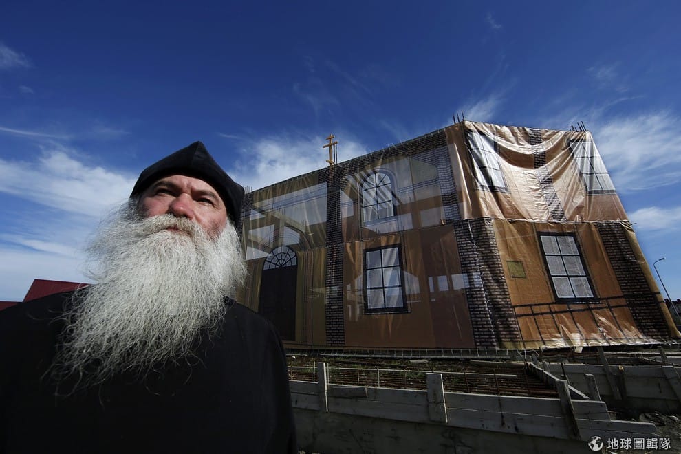 照片中的俄國東正教主教(Russian Orthodox)艾非默(Georgy Efimov)看著遠方,他身後是建造到一半蓋著防水布的教堂。艾非默主教屬於當地的「傳統信仰者」(Old Believers)社群,他們的信仰中心可以回溯到17世紀時期。