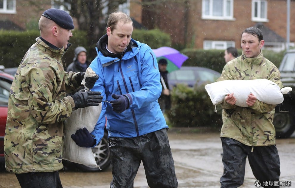 照片中是英國皇室的威廉王子,他加入士兵行動一起搬沙包抵擋大水。據報導,英國遭遇嚴重洪患,威廉及哈利王子暗自加入救援行列,親赴祖母、英國女王伊麗莎白二世溫莎城堡(Windsor Castle)居所附近,協助士兵搬沙包。