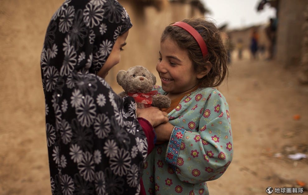 照片中是阿富汗籍的難民小女孩,情人節這天,她們開心地玩著胸前有愛心的熊玩偶。