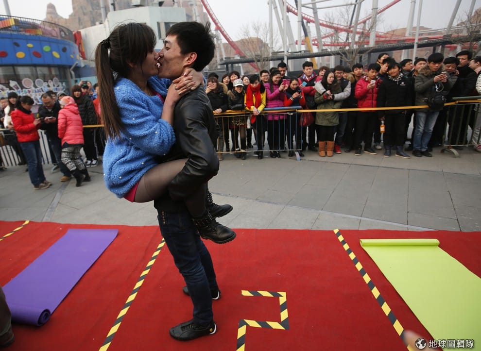照片中是北京的歡樂谷遊樂園區,當地在14號情人節這天舉辦情侶對抗賽,參加競賽的情侶們要用各種特別的姿勢接吻,獲勝的人可以得到iPhone5S手機。