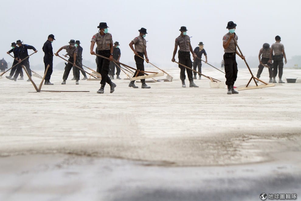 照片中的員警正忙著清掃火山灰,印尼的克盧德火山(Mount Kelud)在14號時出現火山活動,據報導,這次的噴發造成三人死亡,均是因建築物倒塌造成。15號這天,許多暫時關閉的機場恢復運作。克盧德火山上一次噴發是在1990年,當時的噴發造成30餘人死亡。