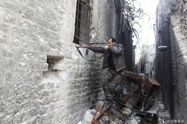 照片中解放敘利亞的反政府士兵出現在阿勒坡的舊城區內,他拿起槍朝建築物內瞄準