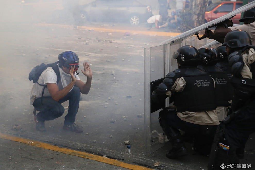 照片中的反政府示威者與員警發生衝突,當地抗議總統的行動已經邁入第四天。15號時,委內瑞拉首都卡拉卡斯再度傳出抗議聲浪,示威者們擋住了高速公路,警方最後使用催淚瓦斯與水槍來驅散丟擲石塊的民眾。