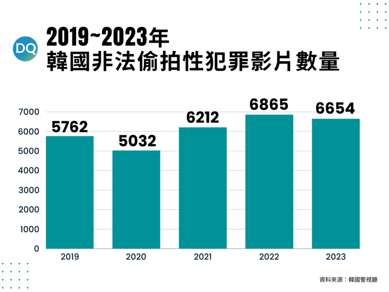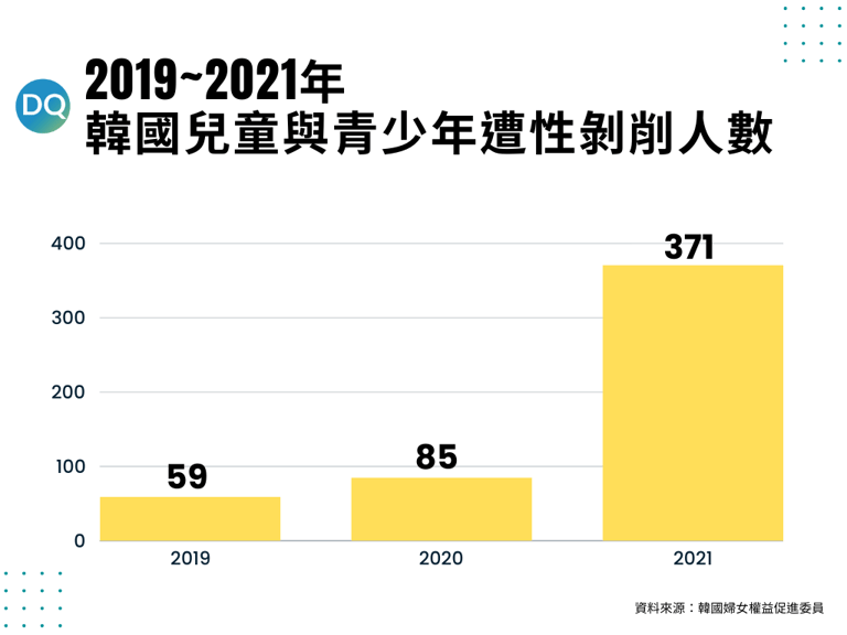 根據性別平等和家庭部(Ministry of Gender Equality and Family)2022年的「兒童青少年性犯罪發生及趨勢分析」報告指出,遭到數位性犯罪包括非法偷拍、強制猥褻、性剝削的未成年數,已從2020年的505人,來到2021年的1016人;其中,在網路上遭「性剝削」的未成年,則從2019年的59人、2020年的85人,來到2021年的371人。
