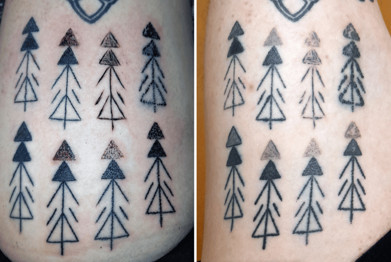 如果細看奧茲的紋身,你會發現,它是由一個一個小點聚集而成。而根據萊迪的示範紋身,利用單點工具手刺的結果,特徵與奧茲的紋身最接近,包含線條的寬度、圖案不規則的邊緣、圓形的傷口以及墨水擴散的情形等。