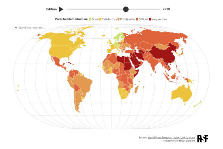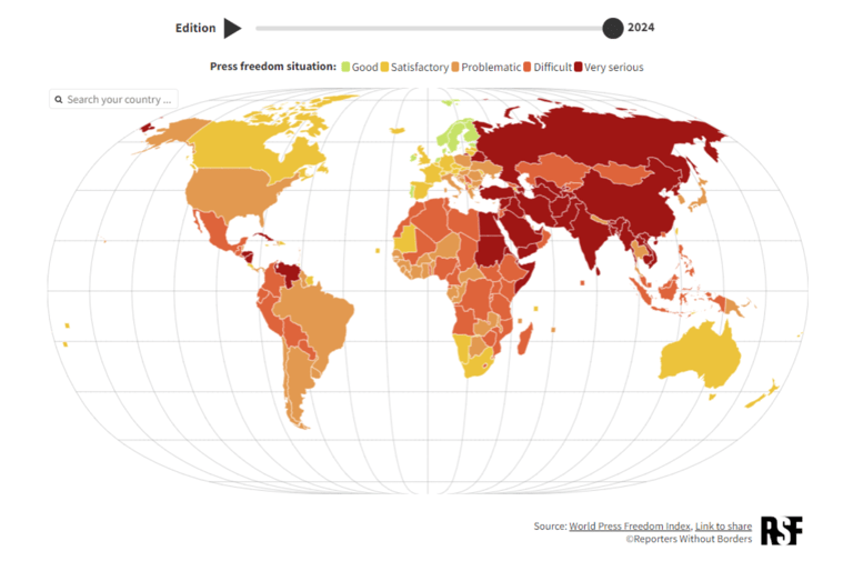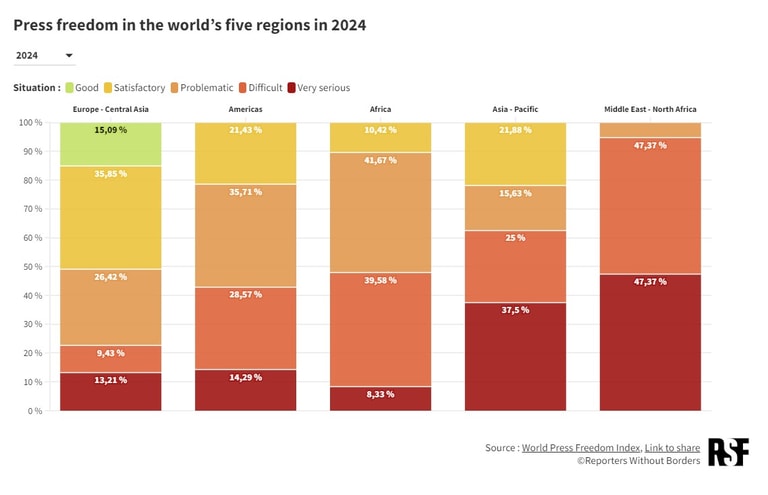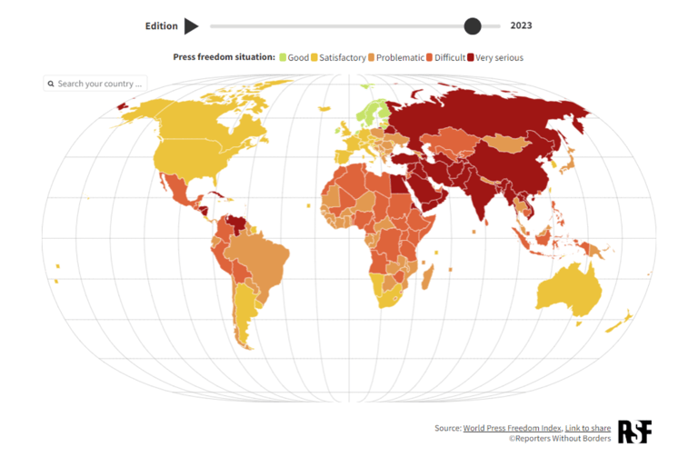 無國界記者組織指出,2024年全球有超過一半的人口都將參與投票,然而全球新聞自由的「政治指標」卻明顯下滑。全球各地區的新聞媒體遭受的壓迫,包括記者遭到拘留、獨立媒體遭壓制,或是假訊息廣泛傳播等。