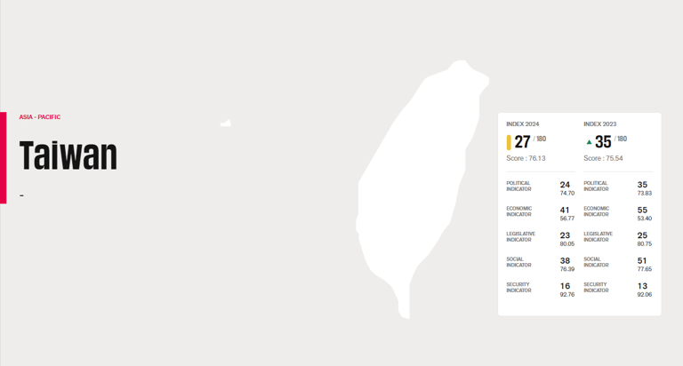 在眾多國家中,台灣今年的新聞自由指數拿下76.13分、全球排名第27名,相較去年成長了8名;且與去年相同,台灣的排名再度維持東亞之首。